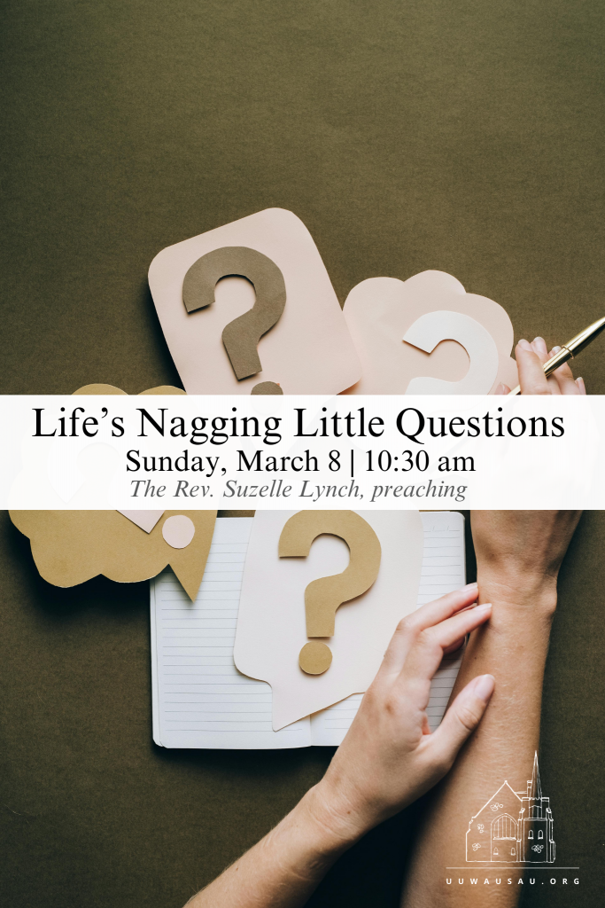 It’s often in times of extremity that “life’s nagging little questions,” questions about meaning, identity, purpose, and truth rise up in us, demanding answers.  Today we explore the ways our UU faith can help us with the questions inspired by today’s moral and political difficulties as well as our personal ones.